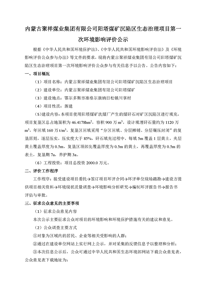 內(nèi)蒙古聚祥煤業(yè)集團(tuán)有限公司陽(yáng)塔煤礦沉陷區(qū)生態(tài)治理項(xiàng)目第一次環(huán)境影響評(píng)價(jià)公示